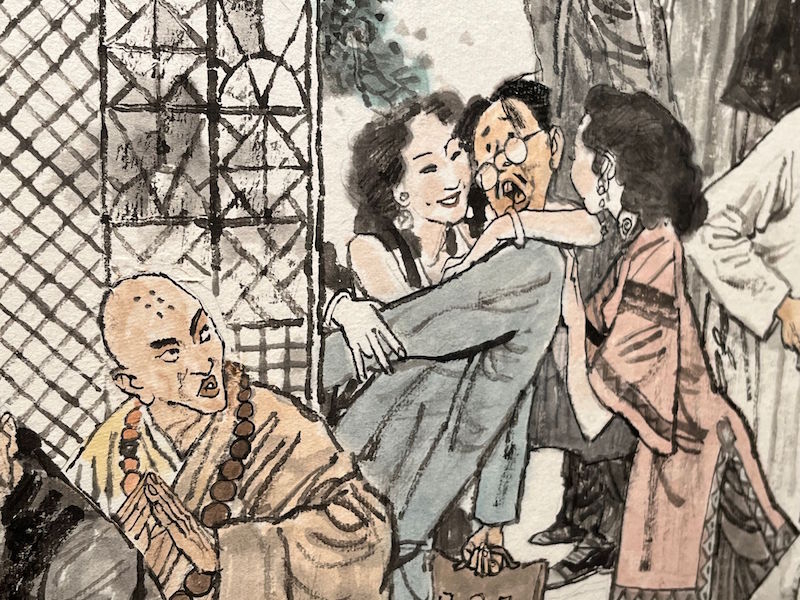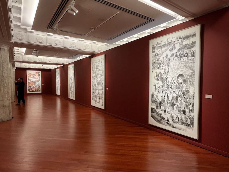 澎湃新闻了解到,此次展览展出的作品选题出自发生于上海各个经典地标区域的老故事。引人注目的还有一组《上海百年纪事》组画,该组作品由《洋泾浜》《九曲桥》《张氏味莼园》《十六铺》《四马路》《爱俪园》《百乐门》《大世界》《上海解放》共九件作品构成。主办方告诉记者,这些作品画面既包含市井百态,也有大量的历史人物和重要的历史事件,希望观众从中了解上海的历史。