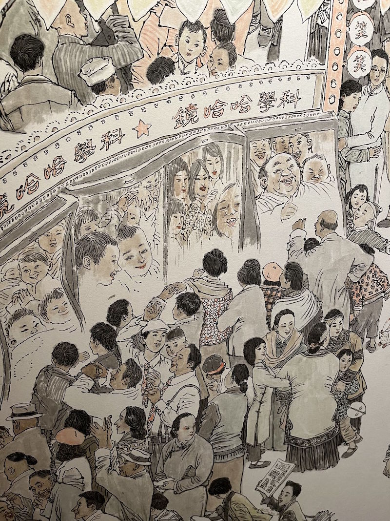 随着欧风东渐,西人东来,人们生活方式也随之改变。在都市化的进程中,诞生了许多新的社会人文景观与都市风景。展厅的后半段,描绘了新中国以后的上海城市景观,包括第一个人民新村——曹杨新村的热闹景象,以及上海世博会的繁华。