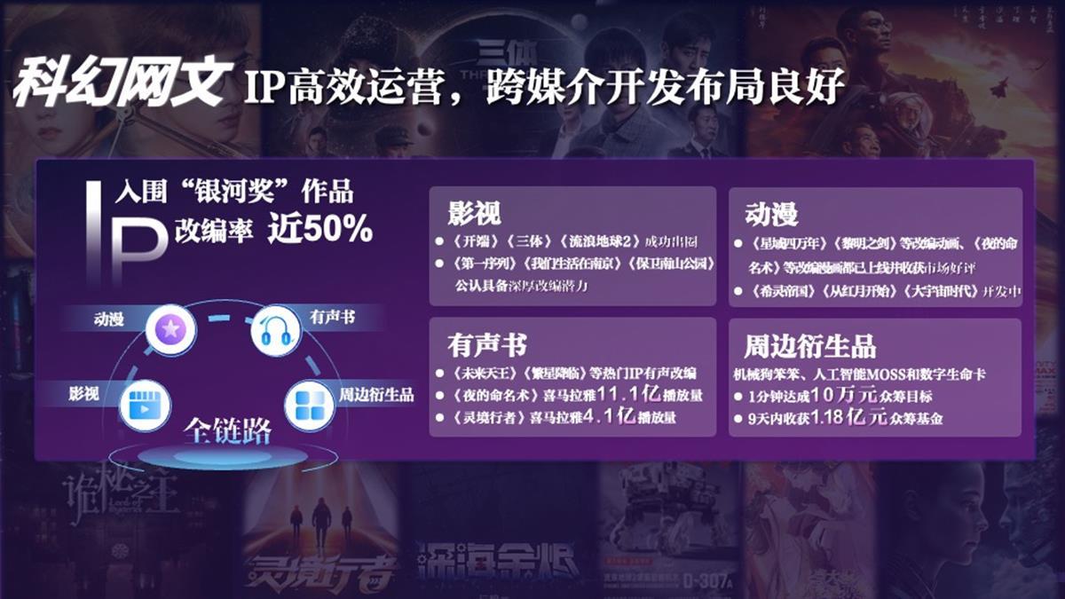 此外,科幻网文IP被批量改编为动漫、有声剧的也越来越多。截至2022年底,入围本届“银河奖”的科幻网络文学作品中,IP改编率近5成——许多热门科幻网文被改编为有声剧、动漫、影视剧。如《星域四万年》《黎明之剑》被改编成动画,《夜的命名术》《第一序列》《泰坦无人声》《繁星降临》被改编为漫画。在喜马拉雅平台,《夜的命名术》有声剧播放量超11亿,《灵境行者》有声剧播放量超4亿。