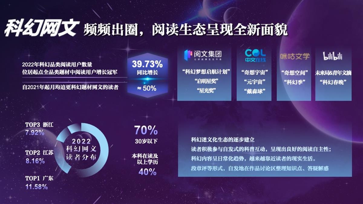 白皮书数据显示,2022年,起点中文网发布了42080部科幻网络文学作品,原创科幻网络文学作品签约量增长30%,是热门品类增长的第一名,规模仅次于作为传统网文品类的玄幻与都市类别。