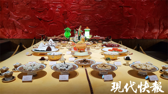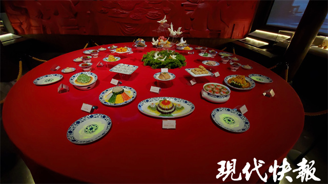 炸年糕、艾窝窝、黄桥烧饼、淮扬汤包、香麻海蜇、虾籽冬笋、炝黄瓜条、芥末鸭掌、酥(火靠)鲫鱼、罗汉肚、镇江肴肉、桂花盐水鸭、扬州蟹肉狮子头、全家福、东坡肉、鸡汤煮干丝、口蘑罐焖鸡、清炒翡翠虾、鲍鱼浓汁四宝、菠萝八宝饭、水果拼盘……记者在中国淮扬菜博物馆看到,这里以菜模的方式完整展现了一桌“开国第一宴”。放眼望去,大多是淮扬菜。