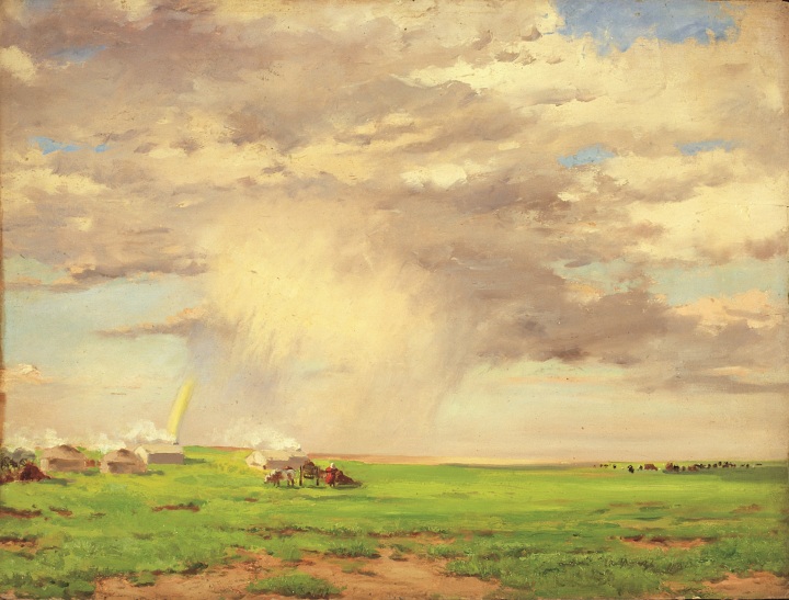 1955年初夏,吴作人先生携夫人萧淑芳先生及几位艺术同道一起远赴内蒙古写生采风。此番行程尽管历时一月有余之久,但主要活动只是在海拉尔地区(今天的呼伦贝尔市)和阿巴尔虎左旗、牙克石市、根河市以及满洲里等几个地方。一方面是因为内蒙古地域辽阔,每到一地都要花费较多的旅途时间;另一方面,吴作人先生的艺术采风绝不是走马观花,而是每到一地就驻扎下来,深入观察了解,现场写生创作,有的地方不只是做做速写,还要做一些油画写生的现场创作,因此也颇费时间;再一方面,吴作人先生每到一地除了艺术活动之外,他还深入基层组织和百姓生活之中,了解当地方方面面的社会发展状况和民众的生产生活情况。吴作人先生的心中永远装着人民,时时刻刻关心着新中国各项事业的建设发展和百姓福祉。由此我们就不难理解吴作人先生创作的《草原云雨》,为什么不是阴雨绵绵的?为什么不是晦暗沉郁的?而是色彩清新响亮,画面充满着朝气,孕育着蓬勃的生机和力量。