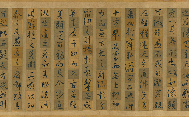 本幅《集圣教序》为后人临仿之作,用笔、间架逼真传神。书者先用不同颜色的纸、绢书写,再拼接装池为手卷形式,藉以凸显集字的特色,甚具创意。