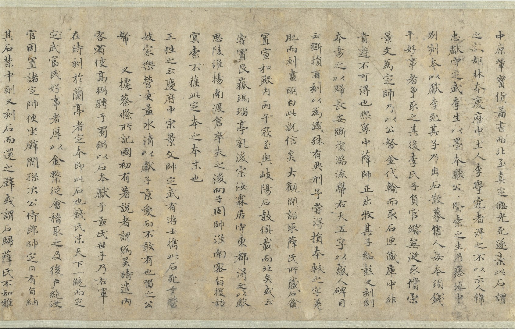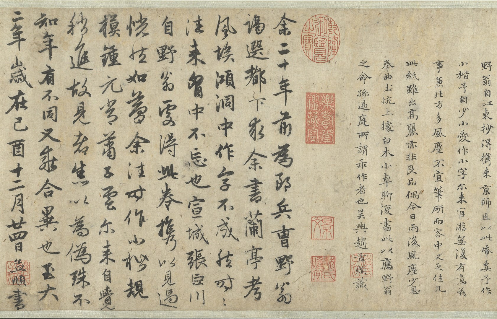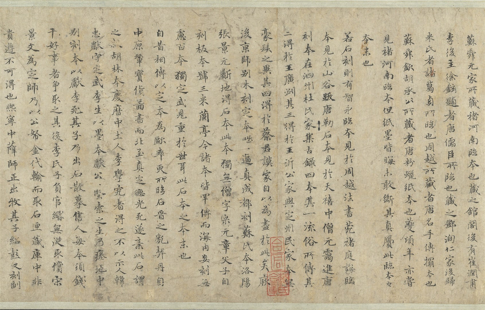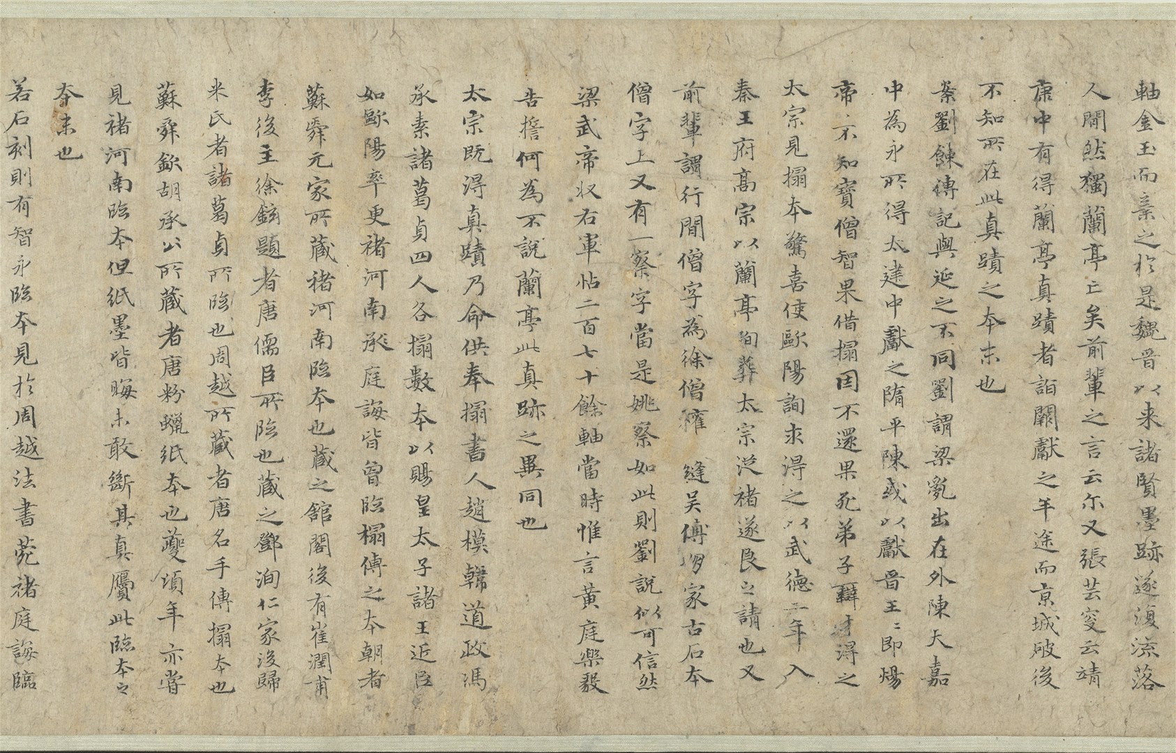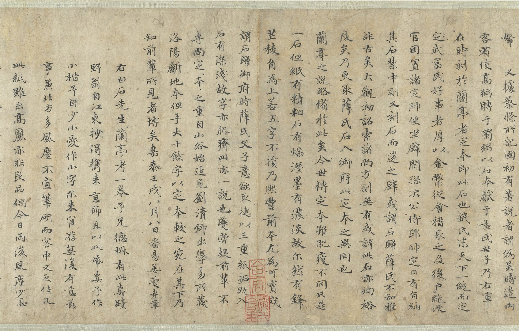 本幅乃赵孟頫应野翁之请,以小楷抄写姜夔(1155-1221)撰《兰亭考》。书风古朴典雅,结字效法〈兰亭〉,予人楷书其形,行书其质之感。本文“亭”字共出现十次,唯独末次将横勾改为横竖勾,一反楷书常态,渊源或许来自魏晋,甚或更早。