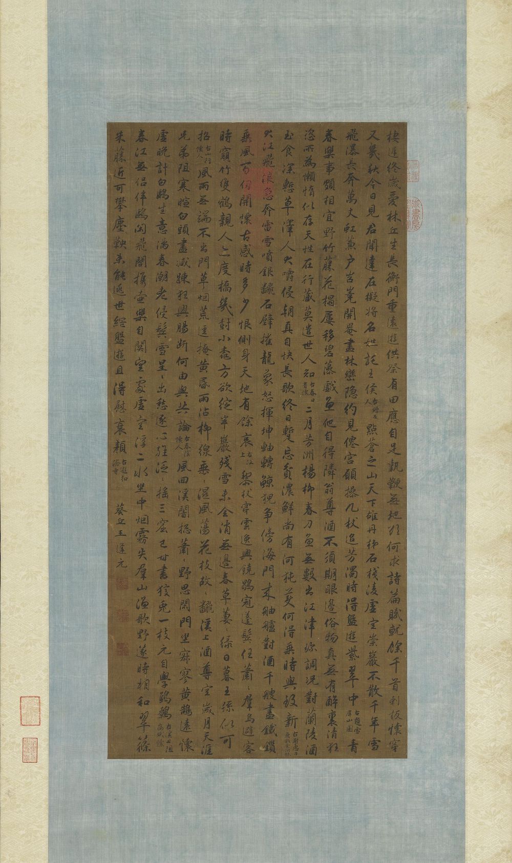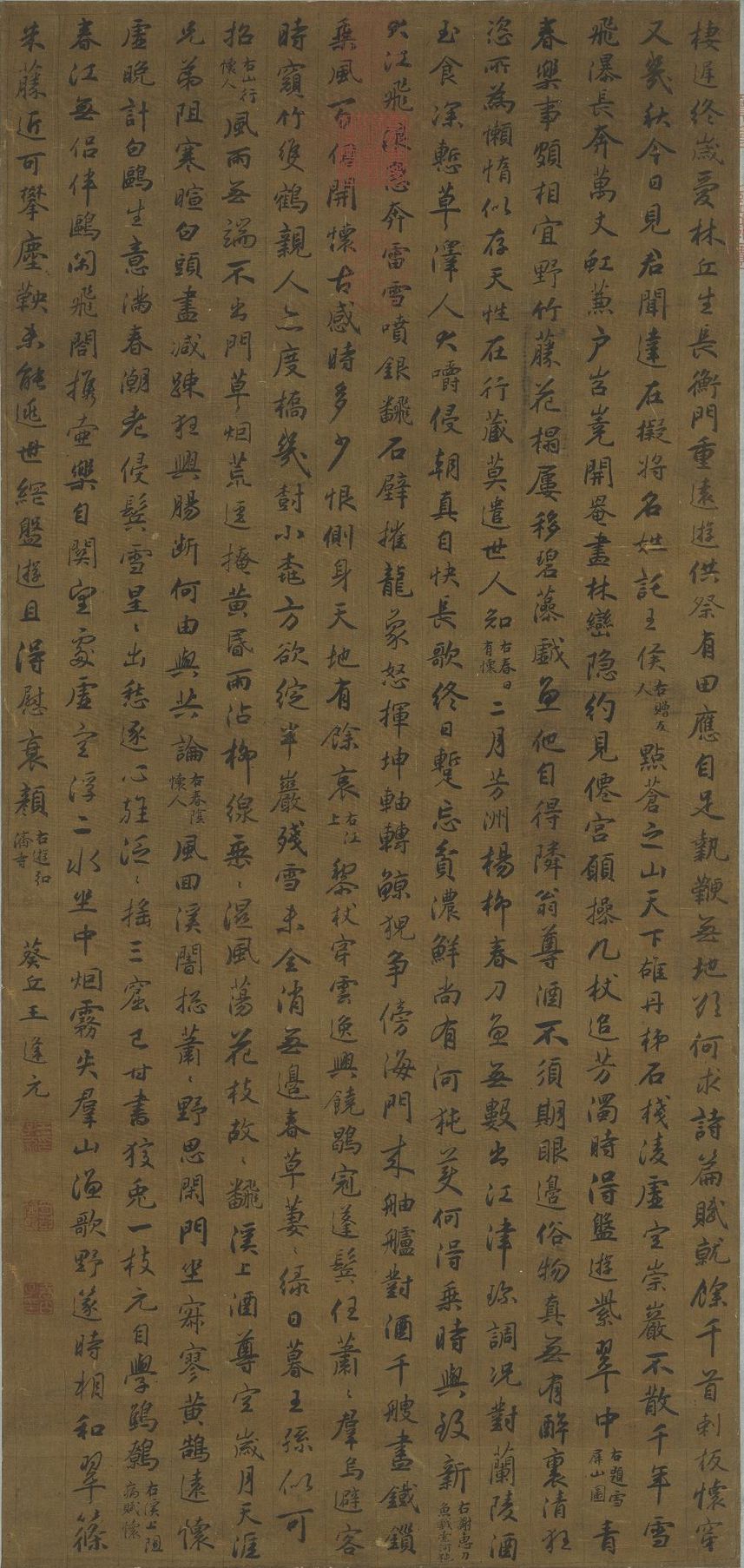 王逢元,生卒年不详,金陵(今南京)人。字子新,号吉山。王韦之子,擅书,楷法钟繇,草法王羲之父子。由于父子俱能书,人遂以大令呼逢元。王逢元以书名于当世,或有人议其真书稍肥,顾璘则谓其庄重沉着,脱去佻巧,独得钟、王遗法。另周晖亦谓其书初学王羲之、智永、晚年乃出入黄庭坚。本幅为乌丝栏本,王逢元以行楷书七言律诗九首,运笔间带有山谷意趣。
