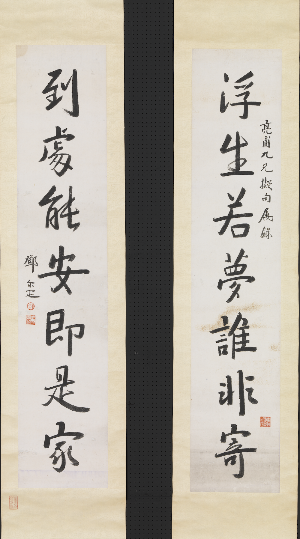 释文:“浮生若梦谁非寄。到处能安即是家。亮甫九兄拟句属录。邓尔疋。”