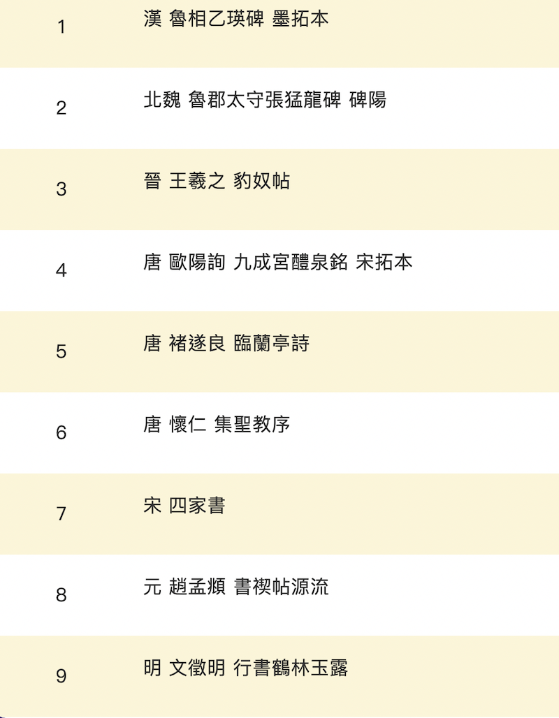 隋唐时代是另一个关键时期,政治统一带来南北各地书风会流,笔法发展臻于完备,从此楷书成为历代通行的书体。入宋以后,为保存前贤书法长远流传,刻帖日渐盛行。但是宋人并不以继承传统为足,书法取向表现个人情性、得其天趣。