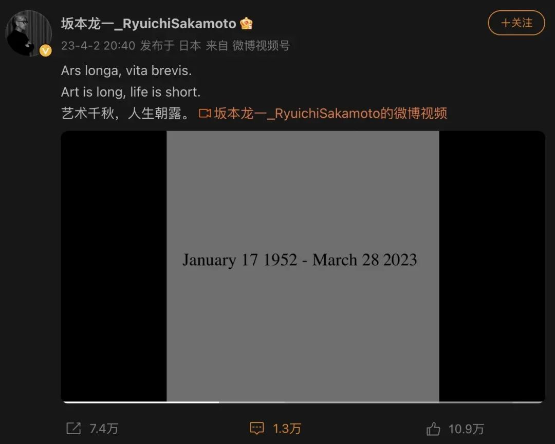 坂本龙一官微的最后一条微博里发布了一段无声的告别视频,视频只有两张图片,一张以灰底黑字形式公布了坂本龙一的出生及去世时间,另一张则是一架破碎钢琴的黑白照片,并配文:“Artislong,lifeisshort。艺术千秋,人生朝露。”