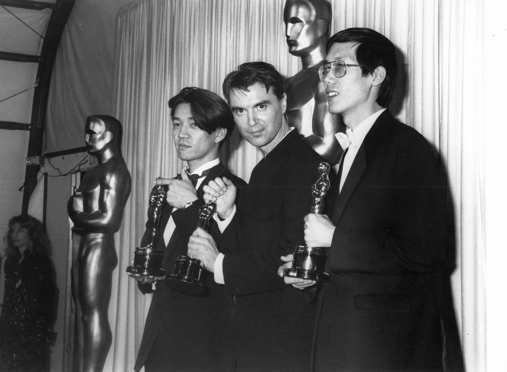 当地时间1988年4月11日,美国洛杉矶,坂本龙一凭借《末代皇帝》获得第60届奥斯卡最佳原创配乐。(右起)我国青年作曲家苏聪(右一)、日本的坂本龙一、和英国戴维·拜恩获得最佳作曲奖。