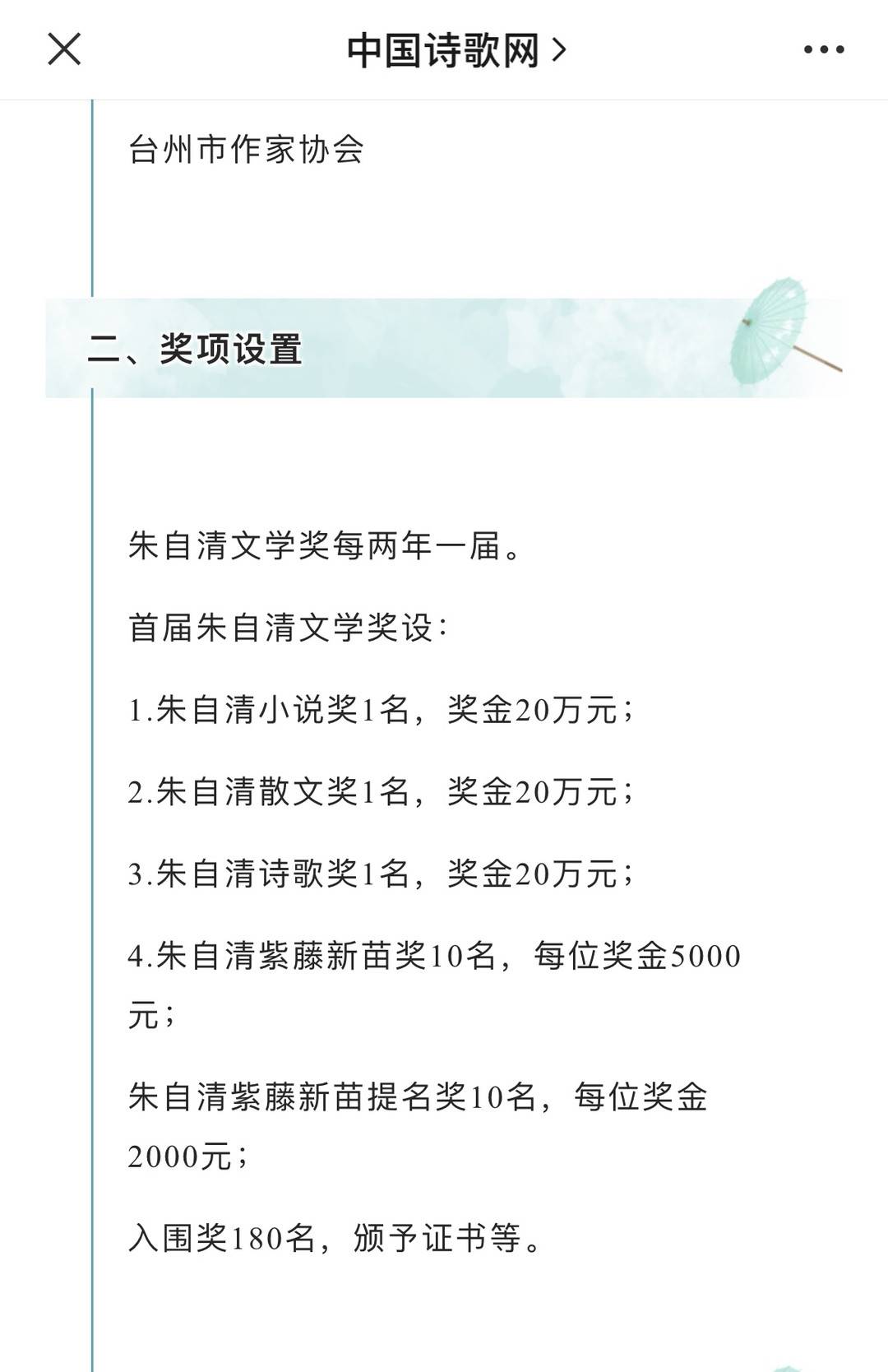 根据中国诗歌网2022年7月20日发布的“首届朱自清文学奖征稿启事”可知,首届朱自清文学奖设:朱自清小说奖1名,奖金20万元;朱自清散文奖1名,奖金20万元;朱自清诗歌奖1名,奖金20万元;朱自清紫藤新苗奖10名,每位奖金5000元;朱自清紫藤新苗提名奖10名,每位奖金2000元。