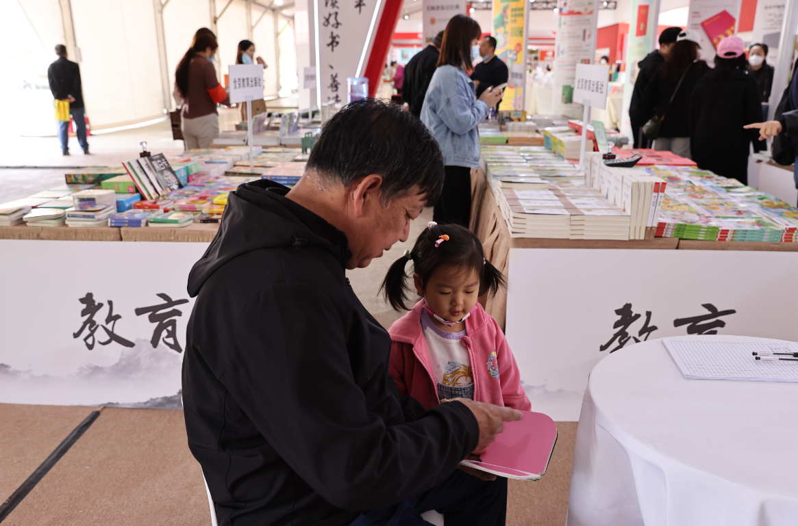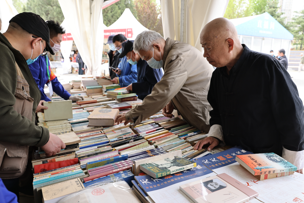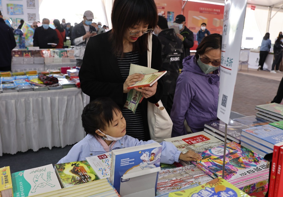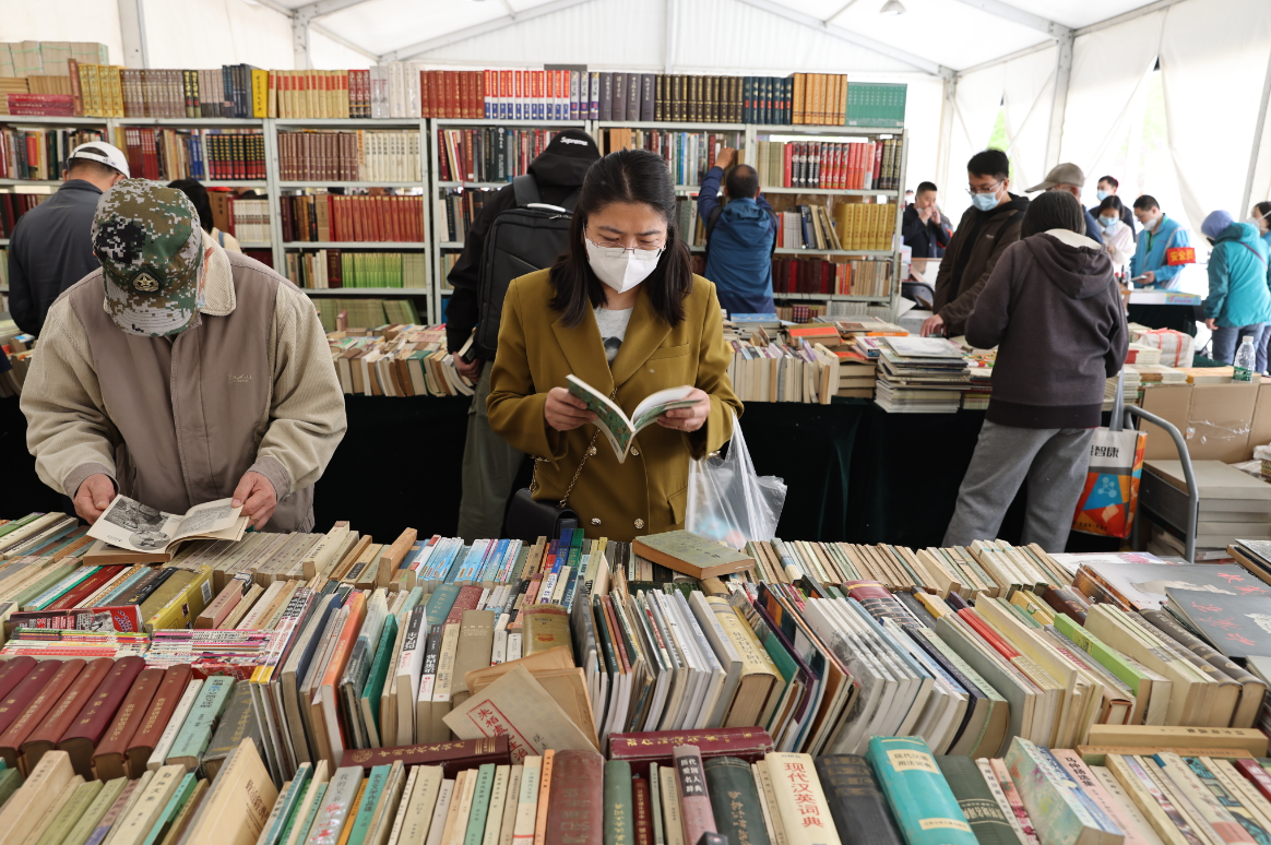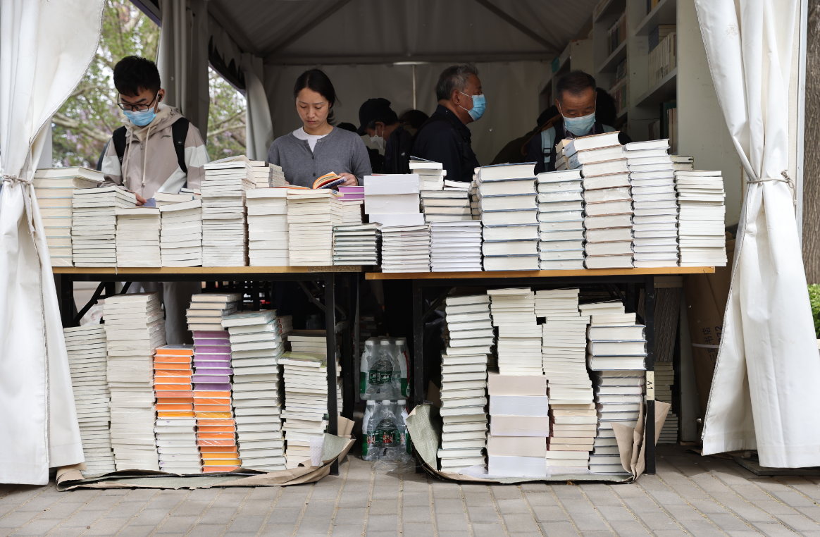 4月14日,读者在2023北京书市朝阳公园主展场阅读选购图书。中国日报记者王敬摄