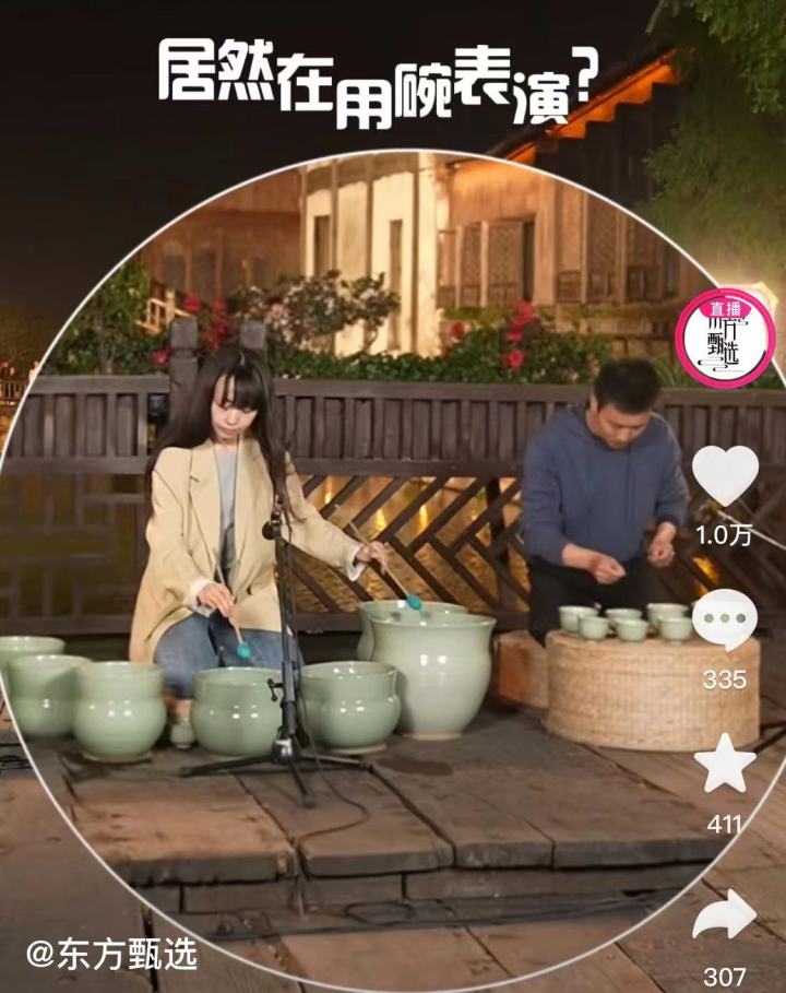 一位小伙对着面前大小高低各不同的青瓷饭碗,一顿疯狂击打,居然奏出了婉约清新的曲调《茉莉花》。