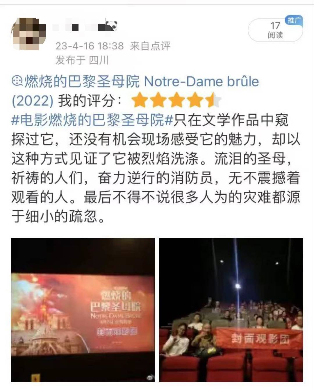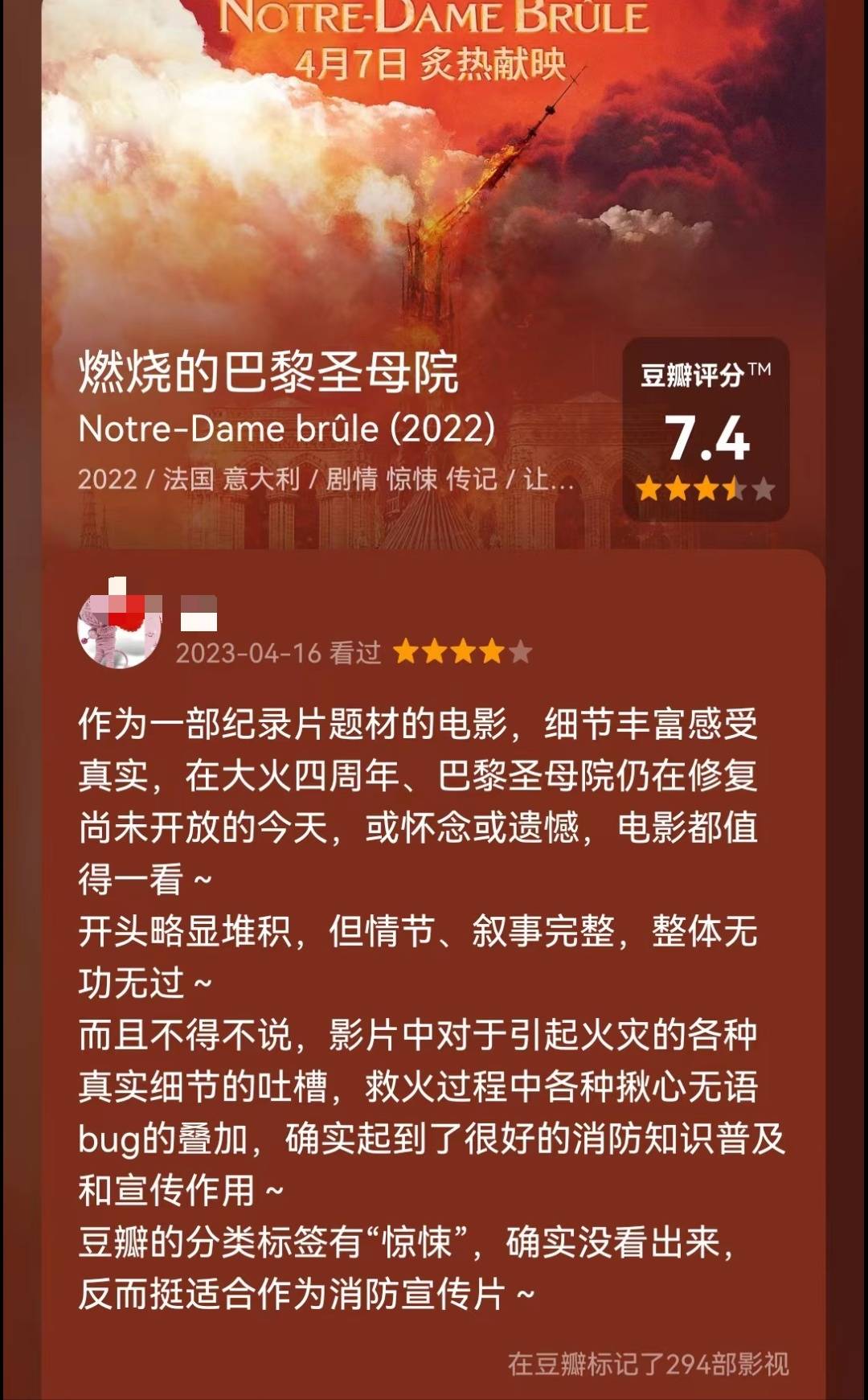 影迷“sangrila”写道:关于巴黎圣母院,只在文学作品中窥探过它,还没有机会在现场感受它的魅力,却通过这样的方式见证了它被烈火洗涤。祈祷的人们,奋力逆行的消防员,无不震撼着观看的人。影迷“狐狸”分享:细节丰富感受真实,在大火四年,巴黎圣母院仍在修复尚未开放的今天,或怀念或遗憾,电影都值得一看。