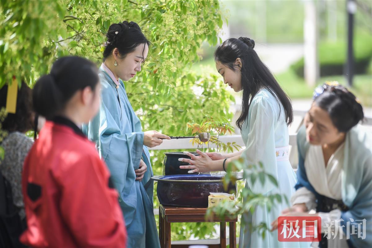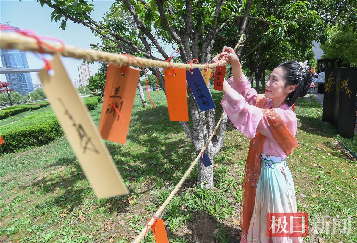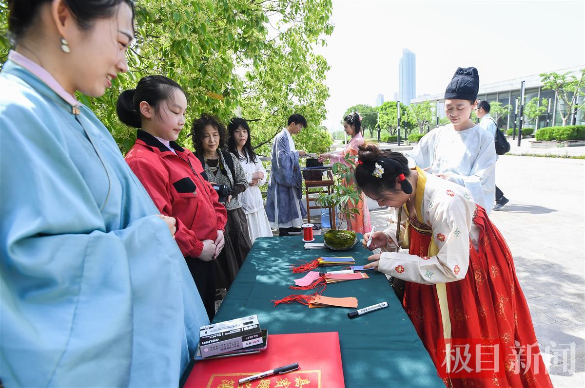 4月15日,“珞雪无痕”和同伴穿着汉服,来到月湖畔,参加“琴韵书香却月城”读书活动。在活动第一个摆台处,借着工作人员舀出的月季花水净手;在第二个摆台处,挥手生香,写出自己对自己或家人的祝福,系于绳上。再往里走,可以选择坐下来,向茶艺老师要一杯茶喝,也可以选择参加“占花名”游戏,看看自己能抽到了哪一支花神签。