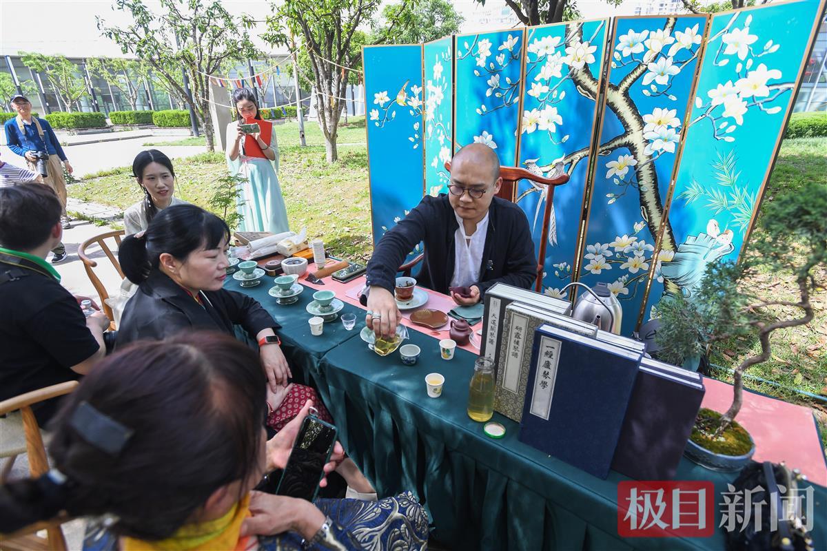位于正中央的舞台上,古香古色的隔断上悬挂着“高山流水”的书法,一旁的博古架上,天青色的天球瓶中插着富贵雍容的牡丹,另一侧有人正在抚琴……好一幅春日雅趣图景!这是在汉阳城市书房·琴台书院楼顶举办的首届“知音读书节”系列活动之“琴韵书香却月城”雅集活动,春意正浓,春风正劲,户外的读书活动别有意趣。