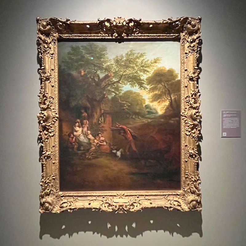 在这一板块的艺术家中,托马斯·庚斯博罗是最知名的人物之一。庚斯博罗是英国皇家学院的创始人之一,亦是英国风景画的奠基人之一。展厅中,其作品《小屋前的人物》并非是人物画,但艺术家以淡雅的色彩绘制了田园小屋前一组正在为自己的生活而忙碌的乡村人物,体现了一种理想化的乡村景象。