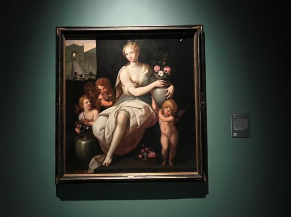 进入展厅,在第一板块“神域”中,首先能看到的是佛兰德裔艺术家安布鲁瓦兹·杜伯瓦笔下的《芙罗拉》,怀抱花瓶,身体扭向一侧,双眼目视前方,似乎正与观者交流。芙罗拉是古罗马神话里的花神,后逐渐从神话画中剥离出来,成为单独的女神像主题,之后又以“扮演芙罗拉的女性”肖像画的形式出现,描绘手持鲜花的年轻女性。在文艺复兴时期,这一主题深受波提切利、普桑等画家的喜爱。而边上,则是西奥多·范·图尔登描绘的古希腊英雄——大力神赫拉克勒斯。