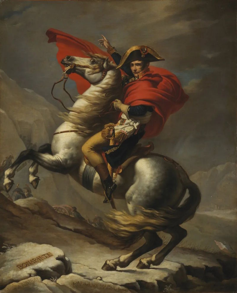 除了贵族人群的肖像外,由雅克·路易·大卫工作室绘制的《拿破仑越过圣贝尔纳山》则特殊的人物画,凸显拿破仑英勇、果敢、坚毅的统帅形象。在1800年的第二次反法同盟战役中,拿破仑率军远征意大利,登上阿尔卑斯山,抄近路越过圣伯纳隘道,以出其不意的打击赢得了胜利。这场战役的胜利,奠定了拿破仑登上权力顶峰的道路,艺术家将这一场景进行了戏剧化的渲染和理想化的创造。