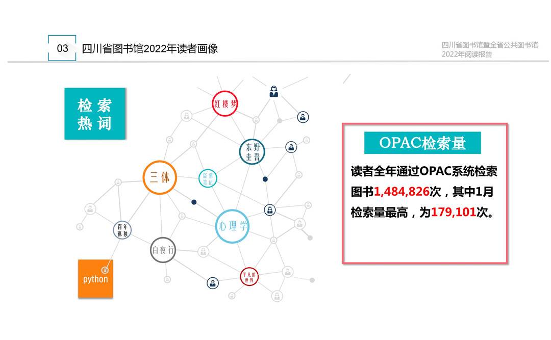 在“热门检索作者”的排名前十的有沈石溪、伍美珍等人。“检索热词”则有心理学、三体、红楼梦、平凡的世界、百年孤独、东野圭吾、白夜行、盗墓笔记等。由此可见,路遥的《平凡的世界》两次上榜,可见在大众读者中的影响力。