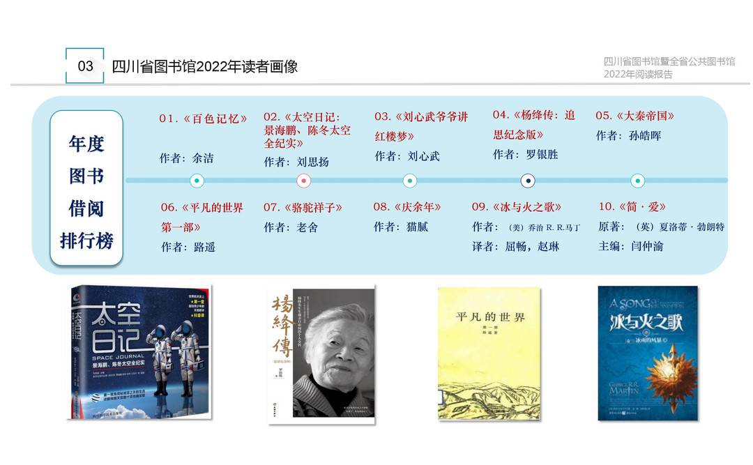 报告显示,四川省图书馆的2022年度图书借阅排行榜上,排名前十的分别是:《百色记忆》《太空日记:景海鹏、陈冬太空全纪实》《刘心武爷爷讲红楼梦》《杨绛传:追思纪念版》《大秦帝国》《平凡的世界》《骆驼祥子》《庆余年》《冰与火之歌》《简爱》。