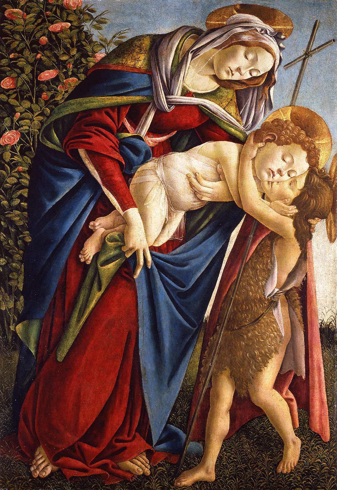 这幅作品描绘了圣子耶稣和表兄施洗者圣约翰见面的场景。圣约翰是一位受人尊敬的圣人,是佛罗伦萨的守护神,也是圣人的典范。15世纪90年代起,波提切利逐渐采用简朴的画风,刻意忽略正确的规则去表达空间及人体解剖,转而专注于呈现圣像自发传递的信息。许多画家参照这幅《圣母、圣子与施洗者圣约翰》临摹,由此可见它的重要性。