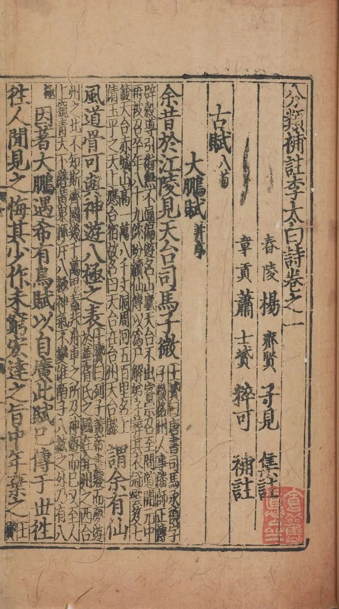《分类补注李太白诗》二十五卷,是现存最早的李白诗歌注本,由萧士赟在杨齐贤集注基础上删补而成。此本存二卷(卷一至二),有明代修版。刘启瑞旧藏。入选第二批《上海市珍贵古籍名录》。