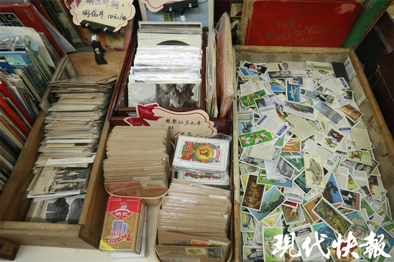 除了旧书,这里还是一个小型博物馆。从老旧粮票到70后童年里的小人书,从上世纪的复古香烟卡到各式中古饰品,各种各样的复古老物件让这家宝藏小店别具一格,透着浓浓的年代感和怀旧风。阚炜是一个很爱收藏的人,这些年,他从世界各地淘了不少东西。5年前,他在店里设置了专门的区域卖老物件。“很多都是我的私人收藏品,尤其放在2楼的,有的只展示不卖的,舍不得卖。”