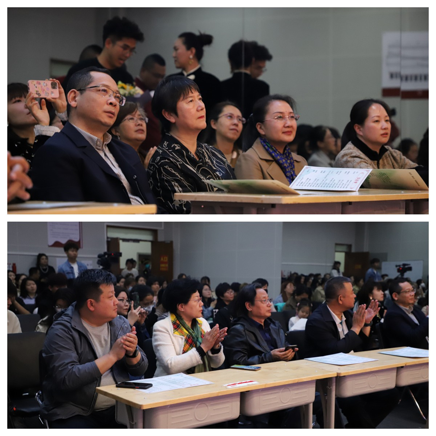 学院党委副书记、院长张玉柱,党委委员、党政办公室主任张瑞斌、宣传统战部部长刘惠华,呼和浩特市民盟主委、学院公共外语教学部主任李丽琴,发展规划与科技处处长刘佃林、团委书记张婧、师范部主任李江南、宣传统战部副部长苏宇、国际教育部副主任杨丛林和70余名师生代表一起观看了演出。