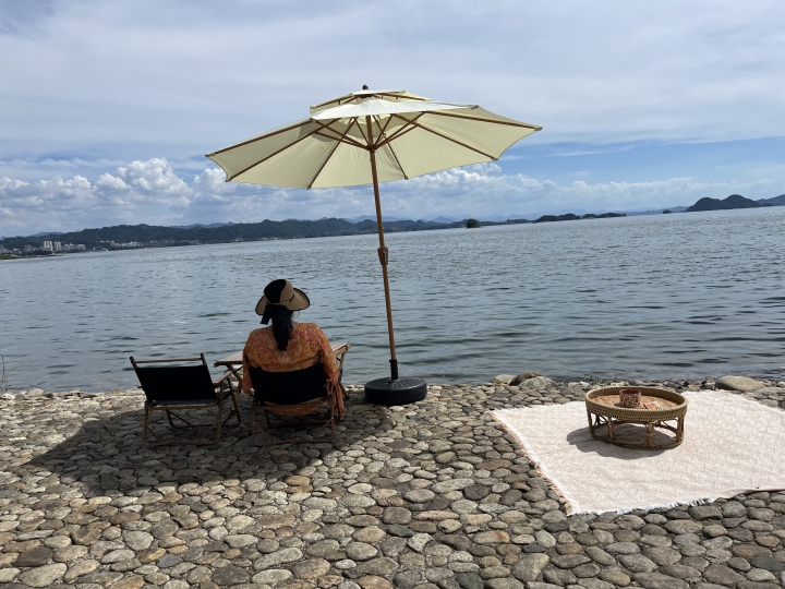 我们去传说中著名的网红打卡地——“日落.下午茶”打卡,正是下午时分,海边的艳照高照,不,这明明是湖,但这湖此刻就像海。像大海的颜色,像大海的海滩。几顶大阳伞支在“海滩”边,阳光下的阴影处,是几处小情小调的小静物。穿漂亮衣裙的姑娘们不时坐在太阳伞下,让人拍下这美丽动人的时刻。