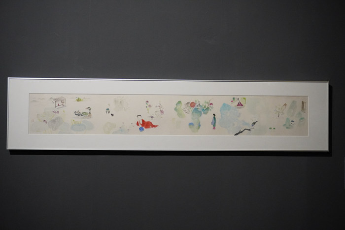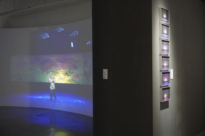 吴洪亮曾为艺术家丘挺策划个展和雅集,并与赖声川导演共同促成了丘挺为新版的《暗恋桃花源》绘出《桃花源》长卷,融入了《暗恋桃花源》舞台的背景。此后,新媒体艺术团队限像工作室基于丘挺的“桃花源”系列作品完成了数字生成影像《桃幻》。音乐人张曼为影像作曲,画面节奏在算法的驱动下与音频数据信息做强关联联动,进一步探索视觉与听觉的共鸣。展览中这一景题从中国园林的实景中吸取灵感,更好地将观众代入到桃花源的意境当中。临近《暗恋桃花源》的影像作品,来自艺术家王濛莎的《镜花水月》描绘了一个脱离世俗的桃花岛。红衣女子卧游春日庭院,可以欣赏到江南早春的花朵、亭台楼阁、鸟语花香,如同一场东方爱丽丝梦游仙境抑或水墨乌托邦。