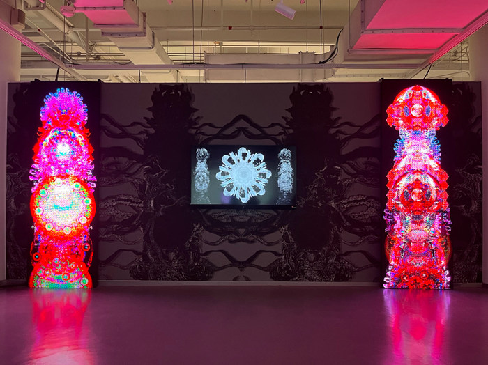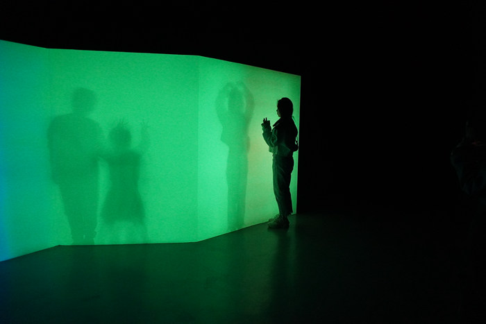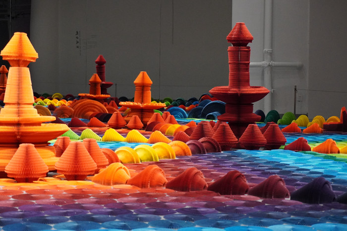 在金鸡湖美术馆中,李洪波的《花海》一片灿烂。他从传统的纸灯笼和拉花中得到灵感,折纸变形的过程形成一片花海。陈抱阳的交响声音装置涵盖了人类历史上多种多样的打招呼方式,年轻的艺术家唐古拉作品中呈现出这一代“数字原住民”的天马行空,师丹青与缪应昊借新媒体表达深入到自然界更为微观的层面,沈凌昊则利用感光材料的特性,在空间中留下观众的身影,声、色、电、光完美呼应。