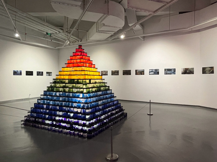 吴洪亮:这个题景是跟古人学的,每个景致都有不同的题法。每个题景都自带美感,但是我觉得最好玩的是最后一个——“笑看不穿”。只要对苏州稍有了解的人,应该都会知道唐寅和他的《桃花庵歌》。很多评弹艺术家、电影演员都会诵读。这首诗有很多版本,我选择了这个:他人笑我太疯癫,我笑他人看不穿。我想到这个板块和这首诗的时候,联想到的是艺术家杭春晖在2020年广东美术馆个展“本之末”中做的一个作品。为了让那次展览呈现出广东的烟火气,杭春晖带着他的团队去了深圳的大芬村,那是全世界生产商品绘画最多的地方。他在那里不仅拍摄了很多在大芬村的绘画工作者,还因为突然而至的想法将这些人当时剩下的颜料罐都收集下来,最后做成了一面墙,还有一根柱子,像是巴别塔。此次,这些颜料罐变成了一座金字塔,周身是彩虹的颜色。当他提出这个想法时,我当时就觉得特别感动。都说大芬村的作品是行画,这些绘画者们是画匠,而金字塔象征着崇高。在这个现有的这个空间逻辑里谈论这个问题会更加深刻。金字塔有塔基和塔尖,到底什么艺术的底,什么是艺术的尖儿,艺术家本人提出了他的疑问,这是一个可以留给大家深入思考的问题。“笑看不穿”作为此处的题景,很有意味。