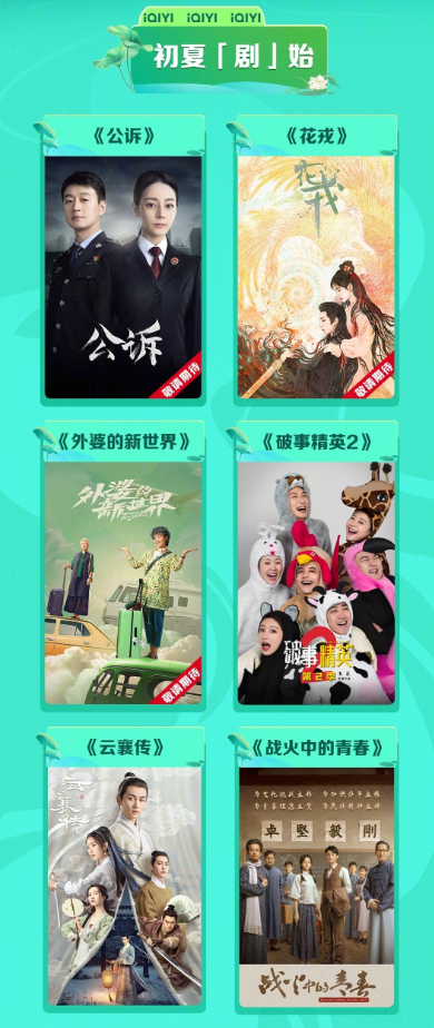 近日,爱奇艺则公布了5月片单,5月播出的剧集包括迪丽热巴、佟大为主演的《公诉》,鞠婧祎、郭俊辰主演的《花戎》,李佳航《破事精英2》,闫妮、邓恩熙、张瑶等主演的《外婆的新世界》等剧。
