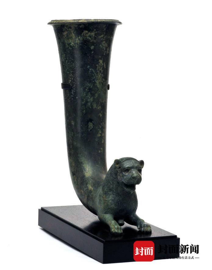 展览中,还有一件狮子形来通杯,其来自古波斯帝国。作为历史上第一个横跨欧亚非三大洲的帝国,在这件文物中,也能看到波斯帝国兼收并蓄,形成了精致、工整、肃穆的风格。