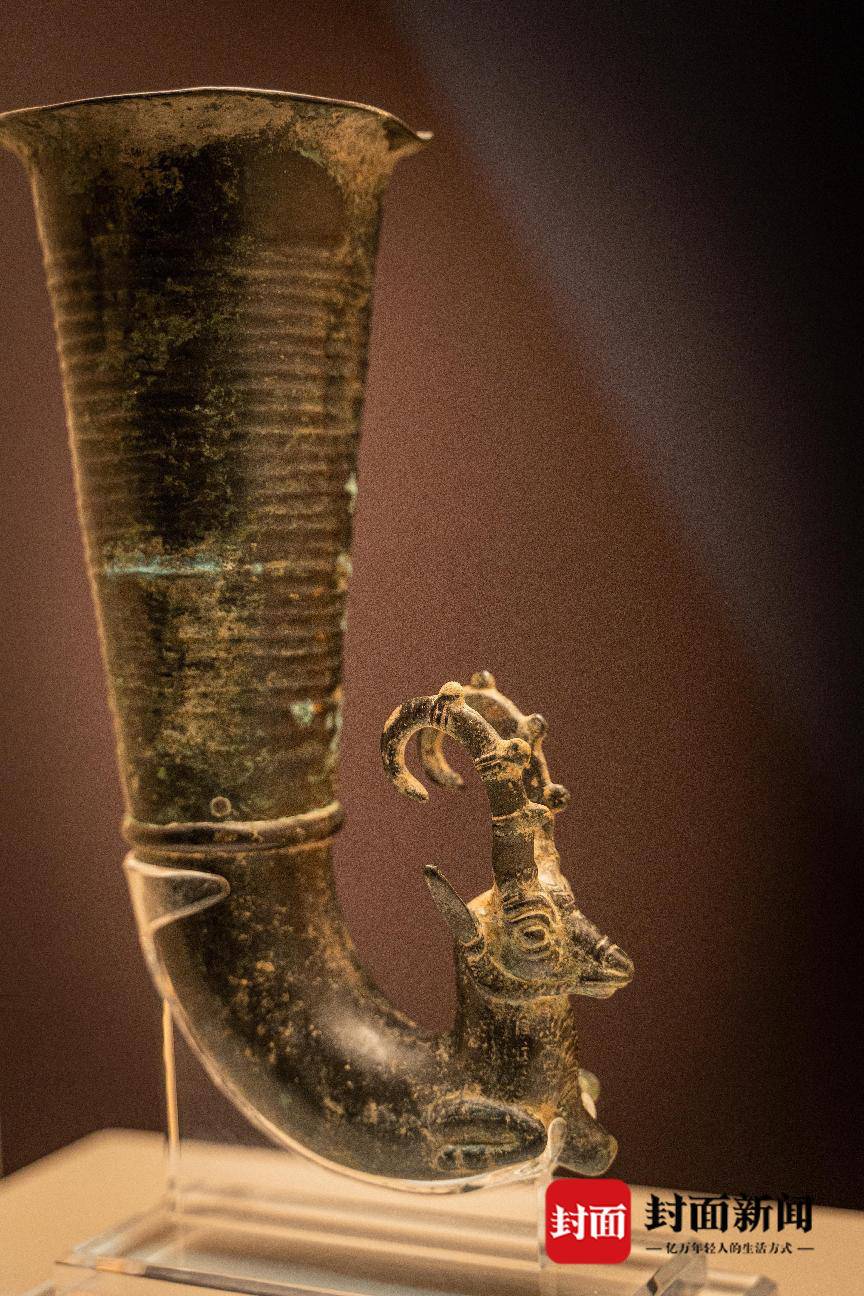 造型各异,璀璨夺目,在展览展出的众多精美文物中,能看到一件来自阿契美尼德王朝时期的山羊形铜来通杯,虽难掩留下岁月的痕迹,但精美的制作及三维立体的兽身造型仍引得在场观众侧目。