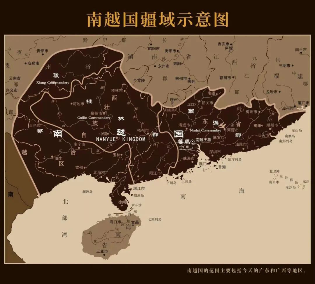 南越国疆域广大,包括今广东、广西以及越南北部等地,至公元前111年被汉武帝派兵消灭,共传五世五王,历时93年。