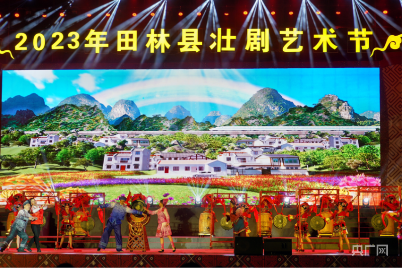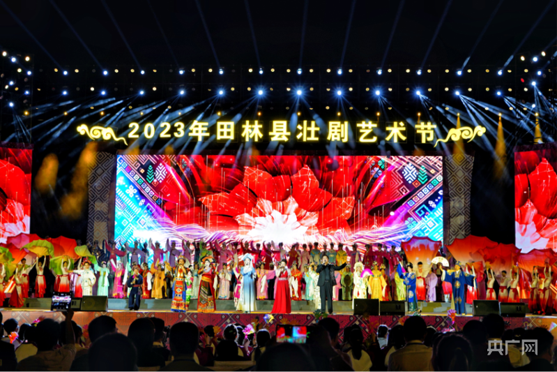 央广网百色5月9日消息(记者黄月芬通讯员梁瑜琳)壮剧歌声四起、马骨胡声悠扬、灯光璀璨炫目……5月8日晚,2023年田林县壮剧艺术节开幕式文艺晚会在广西百色市田林县举办,来自桂滇黔3省区的壮剧团演员身穿民族服饰联袂登台献艺,为壮剧爱好者带来了一场戏剧盛宴。