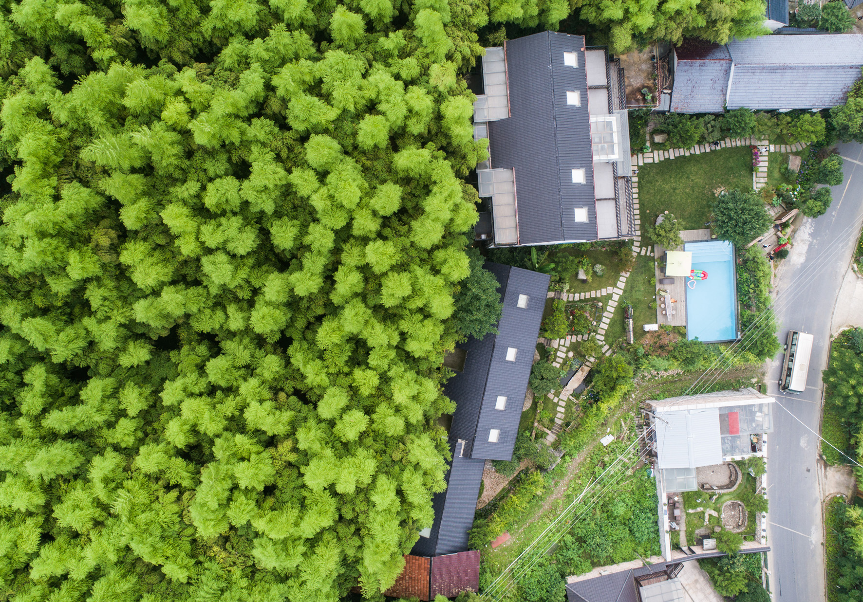 空中俯瞰位于莫干山镇仙潭村的一家民宿(无人机拍摄)。新华社记者徐昱摄
