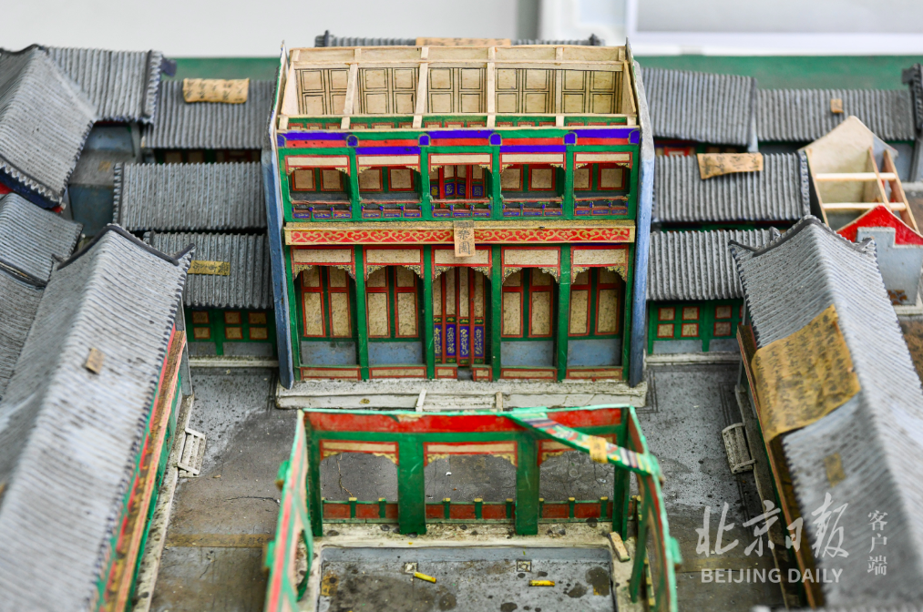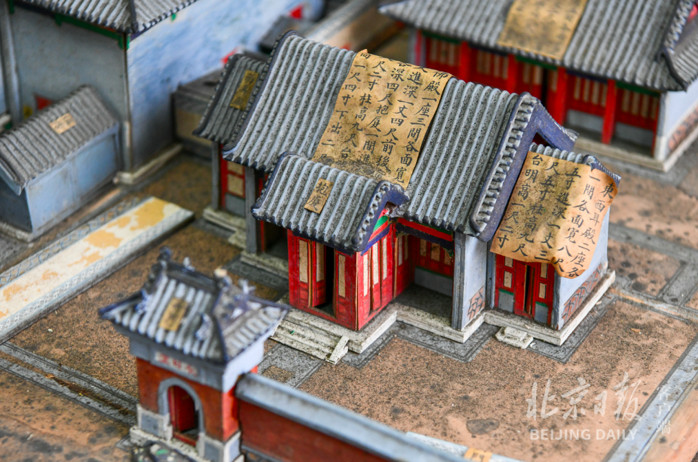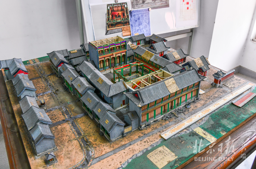 文物修复台上,正在修复的是位于建筑群中央的“戏楼”。三层屋顶和楼层拆开摆放。其中,二层楼身上捆着线绳。“年代久远,烫样的墙体出现变形,有些地方断裂了,我们需要矫正回来。”王熙林举例,用绳子捆、上夹板,垫压卡,熏水蒸气,能用上的手法都得用上。