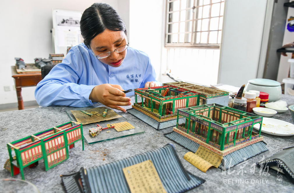 大量的研究工作也已经铺开。杨琴拿着一张“戏楼”屋顶的照片揭秘:“屋顶的制作工序复杂,一般认为瓦垅是用‘沥粉’、‘线香’制作。科技助力,我们看到这件烫样的屋顶瓦垅其实是纸卷制成的。”