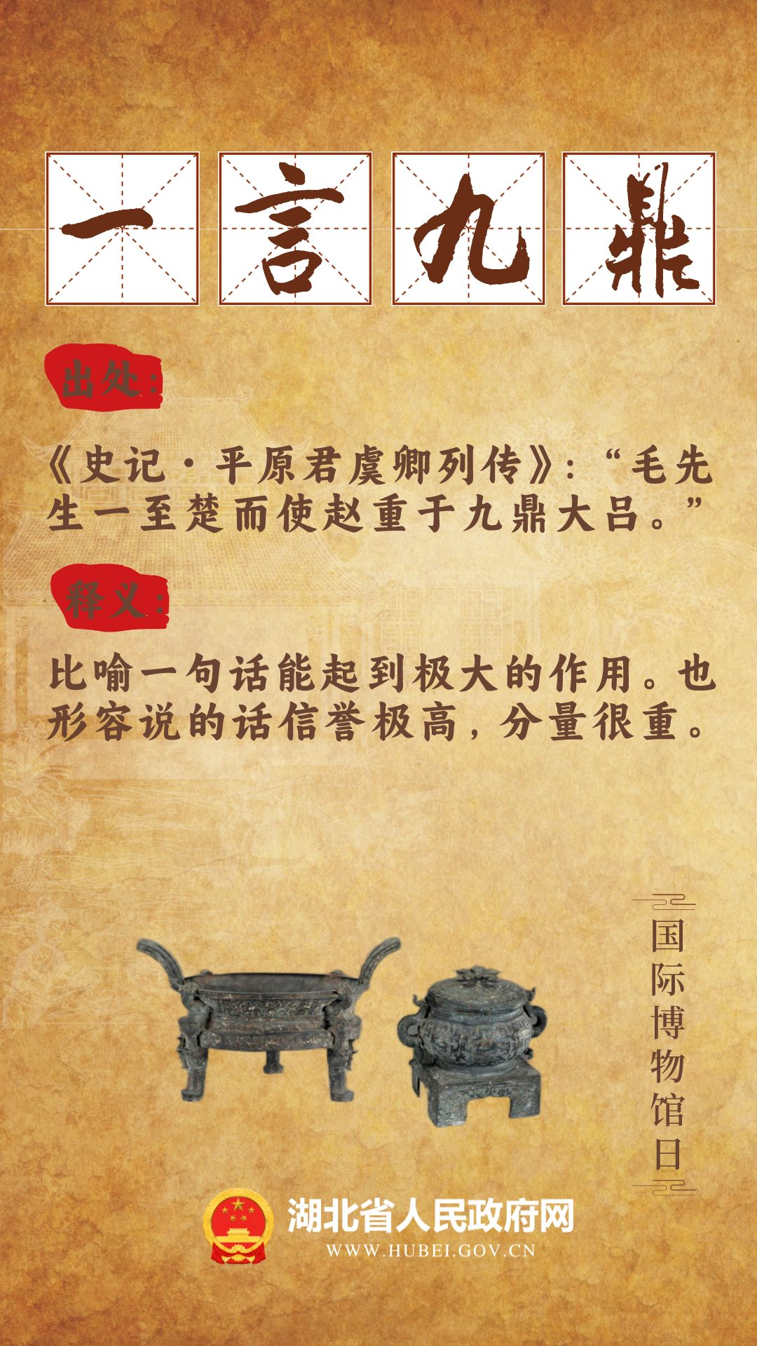 每一种文物都有文化的印迹,一个成语或许就是一则典故。今天是“5���18国际博物馆日”,让我们用成语打开荆楚文化的“大门”,透过文物瑰宝一起回味辉煌灿烂的历史。