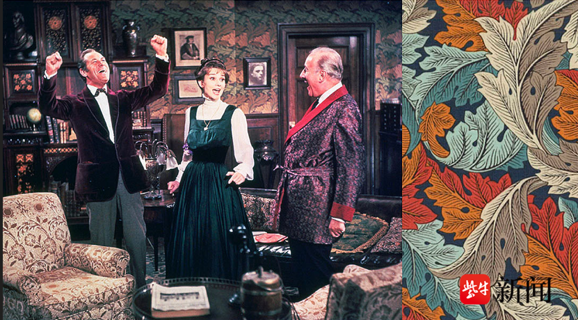 据策展人介绍,威廉·莫里斯1874年设计的“茛苕”壁纸设计图,它来源于对自然的仔细观察而非模仿,同时解决了如何重复的问题。莫里斯希望它可以为印刷商提供颜色搭配的指导,体现了设计和制造之间的密切关系。这种关系也是工艺美术运动的特征之一。近百年后,奥黛丽·赫本主演的奥斯卡获奖电影《窈窕淑女》仍将其作为重要场景壁纸使用。