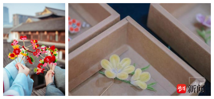 在艺术馆长廊看南京雨花茶制作技艺展示,老茶馆里听苏剧折子戏。“南都繁会·文创市集”公众体验活动则位于艺术馆长廊,不少人沉浸于体验金箔鍛制、绒花制作、趣玩-南都旅行社、趣物-织染绘江南,南京绒花做的耳环、胸针也让不少人种草。
