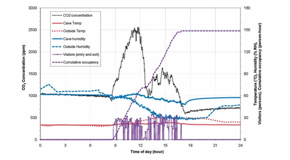 2007年8月19日24小时内,29窟的外部气候、内部微环境,游客和二氧化碳浓度情况图源:Demas等2015