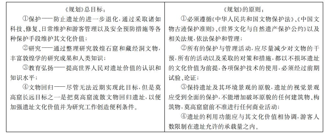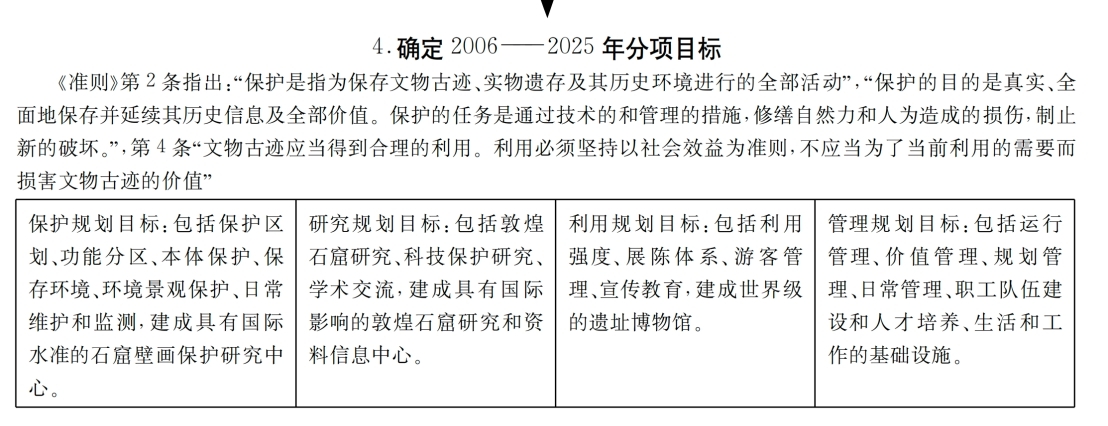 《敦煌莫高窟保护与管理总体规划》总目标及原则图源:樊锦诗《中国文物古迹保护准则》在莫高窟项目中的应用—以《敦煌莫高窟保护总体规划》和《莫高窟第85窟保护研究》为例《敦煌研究》2007)