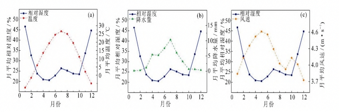 莫高窟区域1992-2021年相对湿度和温度(a)、降水量(b)、风速(c)图源:陈海玲2022