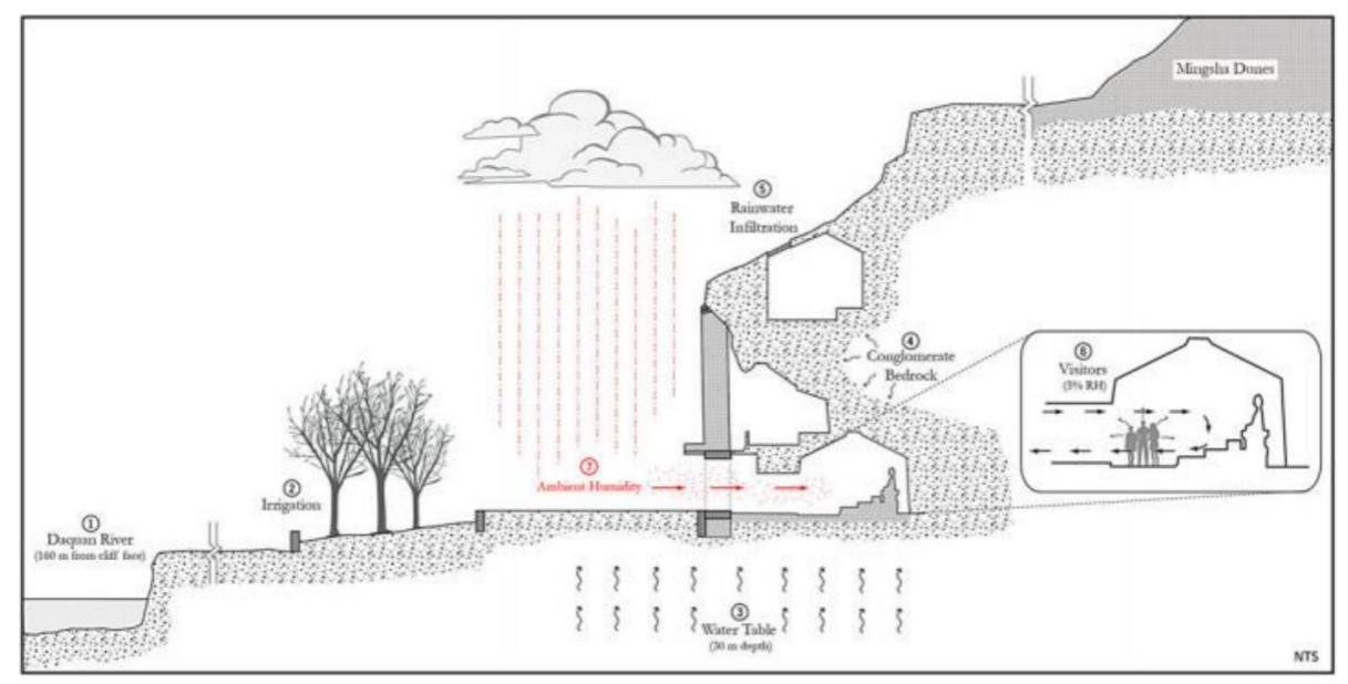 这段石窟示意图,从东边的大泉河到西边悬崖上方的鸣沙山沙丘,总结了过去和现在水分来源对洞窟及壁画艺术的影响图源:Demas等2015
