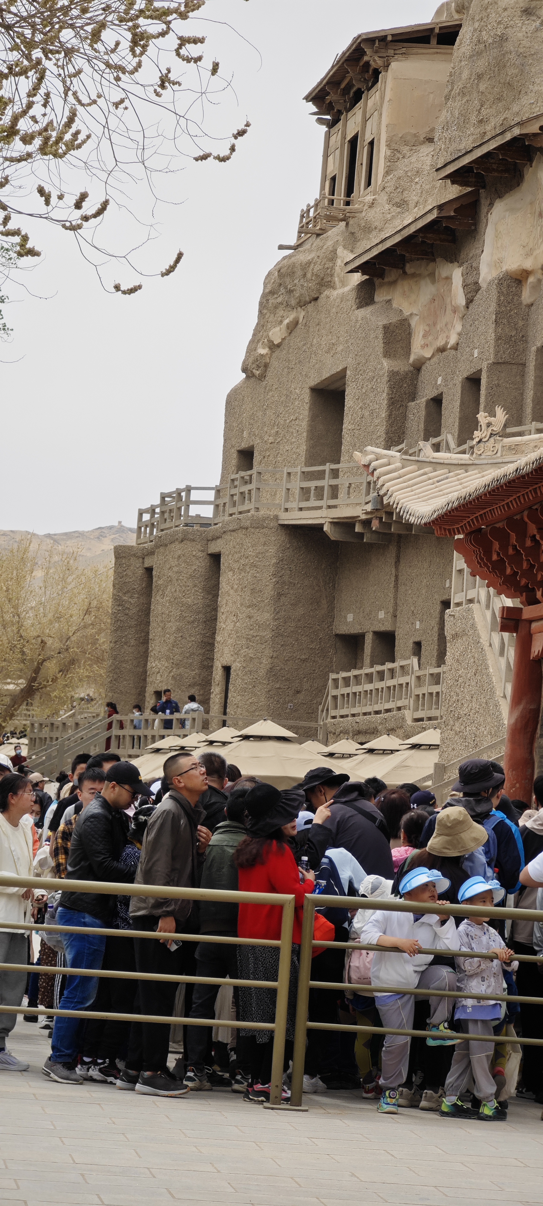敦煌的旅游也会影响阳关、玉门关及榆林窟所在城市的经济发展。三年疫情,加上莫高窟周边旅游业发展,敦煌考古编制竟出现无人问津局面,莫高窟及周边石窟也出现人才流失。受2023年五一假期游客数量激增带动,买不到莫高窟门票的游客,分流到榆林窟。平时相对人少的榆林窟,也排起长龙。我在榆林窟看到,讲解员人手不够,老院长也加入了一线检票的队伍。