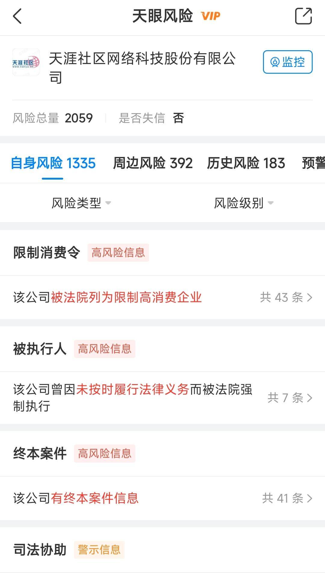 据天眼查APP显示,天涯社区累计被执行1.46亿元,创始人邢明多次被限制消费,风险信息显示,该公司还涉及数百个案件,案由包括名誉权纠纷、侵害作品信息网络传播权纠纷等。