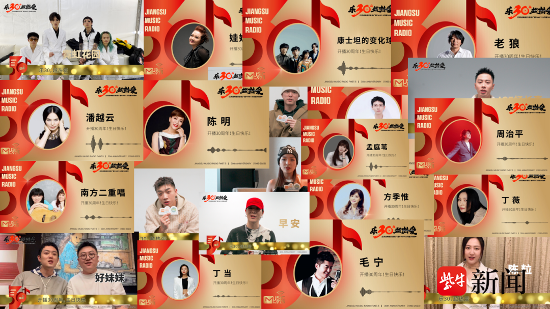 30岁的江苏经典流行音乐广播收到30位大咖艺人送上的隔空祝福:朴树、许巍、徐佳莹、丁当、老狼、孟庭苇、杨乃文、毛宁、陈明、丁薇、郭顶、胡夏、陈粒、周蕙、谢春花、周冶平、好妹妹、康士坦的变化球、方季惟、潘越云、霓虹花园、南方二重唱、娃娃金智娟、艾热AIR、JONYJ、VAVA毛衍七、ICE杨长青、杨和苏KeyNG、早安等。